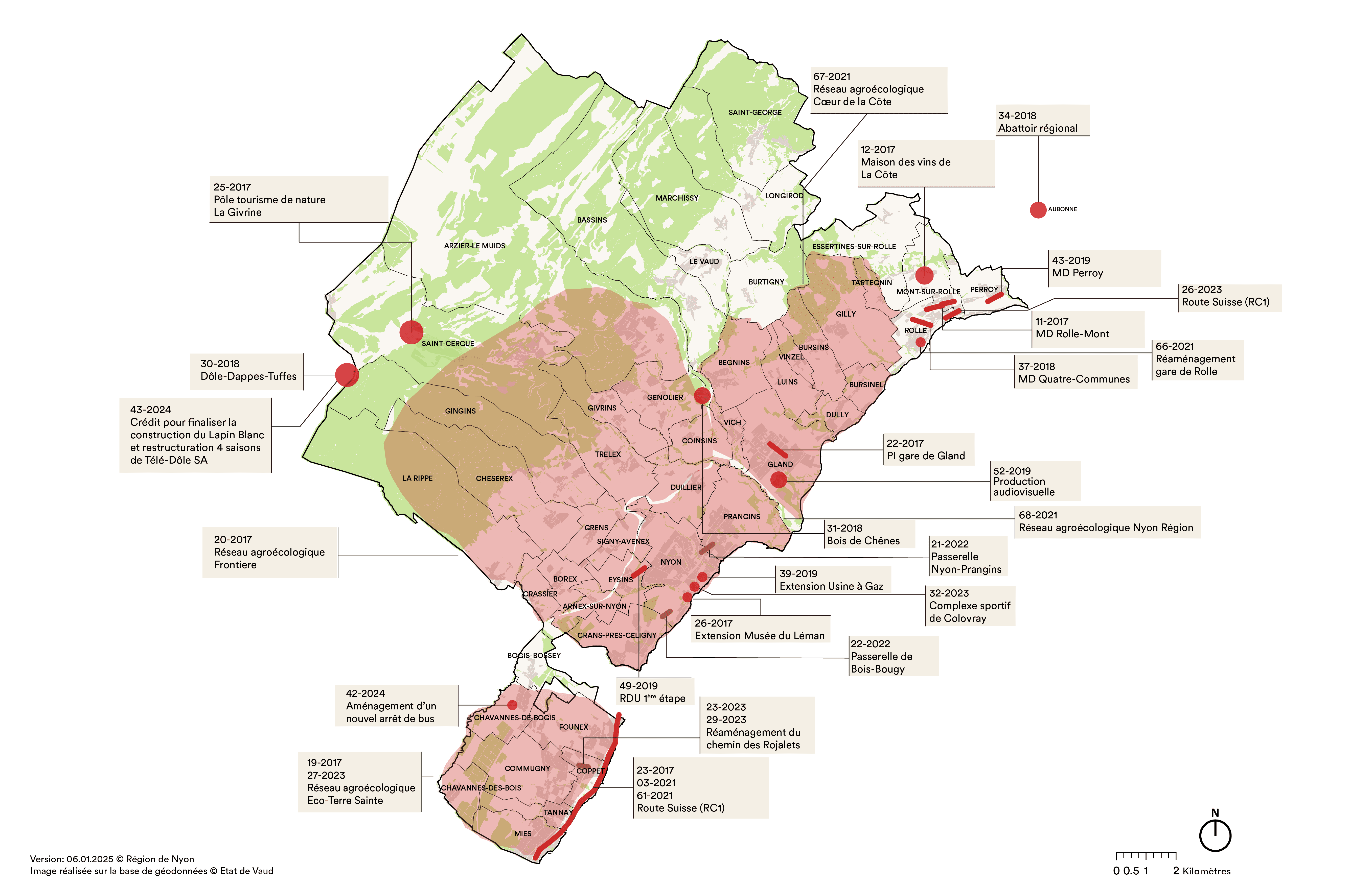 Les conseillères et conseillers intercommunaux se sont prononcés favorablement à la reconduction du dispositif d’investissement solidaire de la région nyonnaise (DISREN) via le préavis 47-2025. La mise en œuvre du mécanisme arrivant à terme fin juin 2025, un vote du délibérant était nécessaire pour permettre aux communes de continuer à bénéficier de cet outil d’investissement-clé après la précédente période de mise en application (2020-2025). Depuis sa création en 2017, l’outil a permis aux collectivités locales de mobiliser des fonds tiers importants pour la réalisation de 30 projets d’infrastructures divers tant par leur nature que par leur localisation (voir ci-dessous).