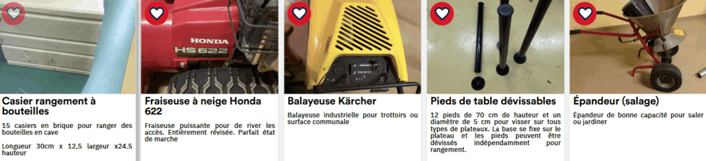 Une quarantaine de profils ont été créés jusqu’ici sur la plateforme. On peut y trouver des objets variés, tels que lampes, barrières Vauban, mobilier de bureau, piano, ou même des objets plus volumineux comme une balayeuse ou une fraiseuse à neige. En désencombrant leurs espaces, les communes et associations donnent une seconde vie au matériel professionnel dormant et stocké inutilement. Elles limitent ainsi le gaspillage et les achats de produits neufs et participent à une initiative de mutualisation des ressources.