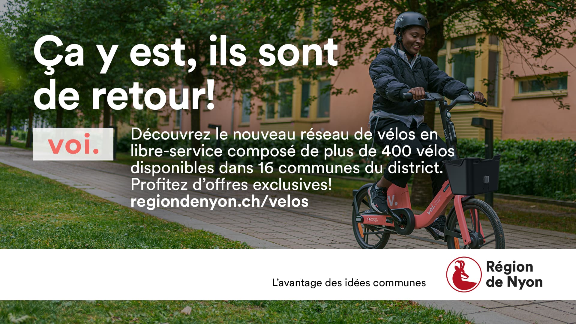 Dès la semaine du 20 avril, le réseau de vélos en libre-service est à nouveau complètement opérationnel dans le district de Nyon. Au total 70 emplacements avec 450 vélos électriques du prestataire Voi sont disponibles dans 16 communes membres de la Région: Mies, Chavannes-de-Bogis, Coppet, Crans, Tannay, Founex, Eysins, Nyon, Grens, Trélex, Gland, Dully, Bursins, Vich, Rolle et Mont-sur-Rolle.
